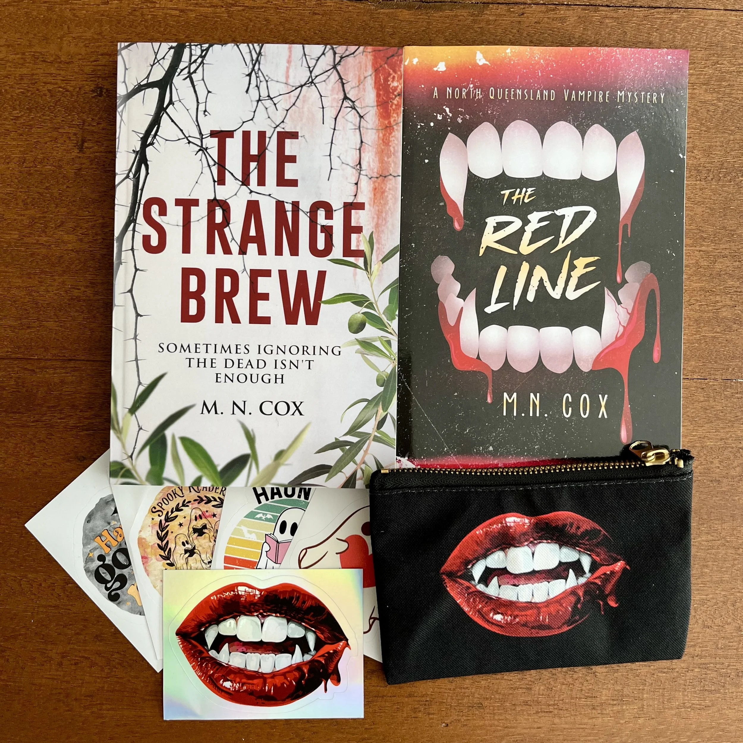 The prize is worth over $75. It includes signed paperback copies of ‘The Red Line’ and ‘The Strange Brew’; a “vamp mouth” zip purse; 4 stickers for spooky book-lovers; and 1 holographic “vamp mouth” sticker.